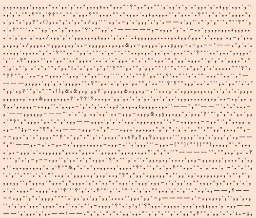 Here’s today’s. The freelance science-and-culture writer Clive Thompson put together a little web tool that allows you to paste in some block of text, hit “submit,” and have it return instantly with all of the alphanumeric characters removed, only the punctuation remaining. He’s posted an article about it at Medium, and it’s truly awesome. The graphic at the top of today’s post is from the first chapter of my new novel & Sons, and there’s something just magical about seeing your own work through some other structure.