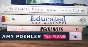 The other thing that’s happening, and you can check this against the books on your own shelves, is that the title of the book is emphasized and the name of the author downplayed. Have a look at this image, from a “book spine poetry” contest entry that reads The Female Brain / Educated / GirlBoss / Yes Please: